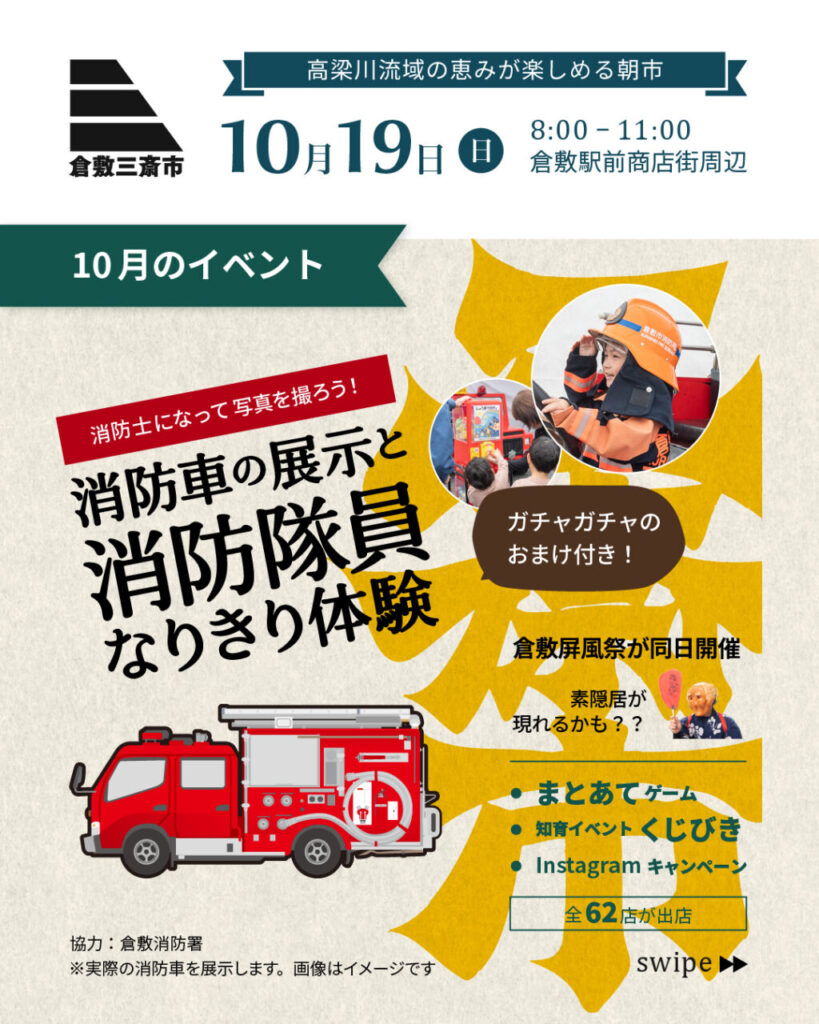 ちいさなお子さまにおすすめ、倉敷消防署の消防車と一緒に、消防隊の制服を着て記念撮影!小学6年生まで対象のイベント、「まとあてゲーム(8時~)」やガチャで会場内の店舗から高梁川流域の産品が当たる「くじびき(9時~)」もお楽しみに。