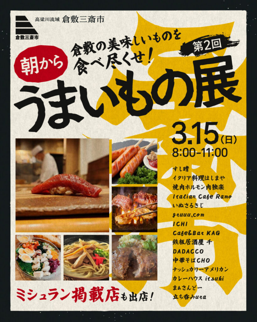 ミシュラン掲載店や気鋭の新店、倉敷らしいこだわりの逸品を提供する 15店 が恵みの広場に集結し、倉敷の“うまい”を朝から堪能できます。